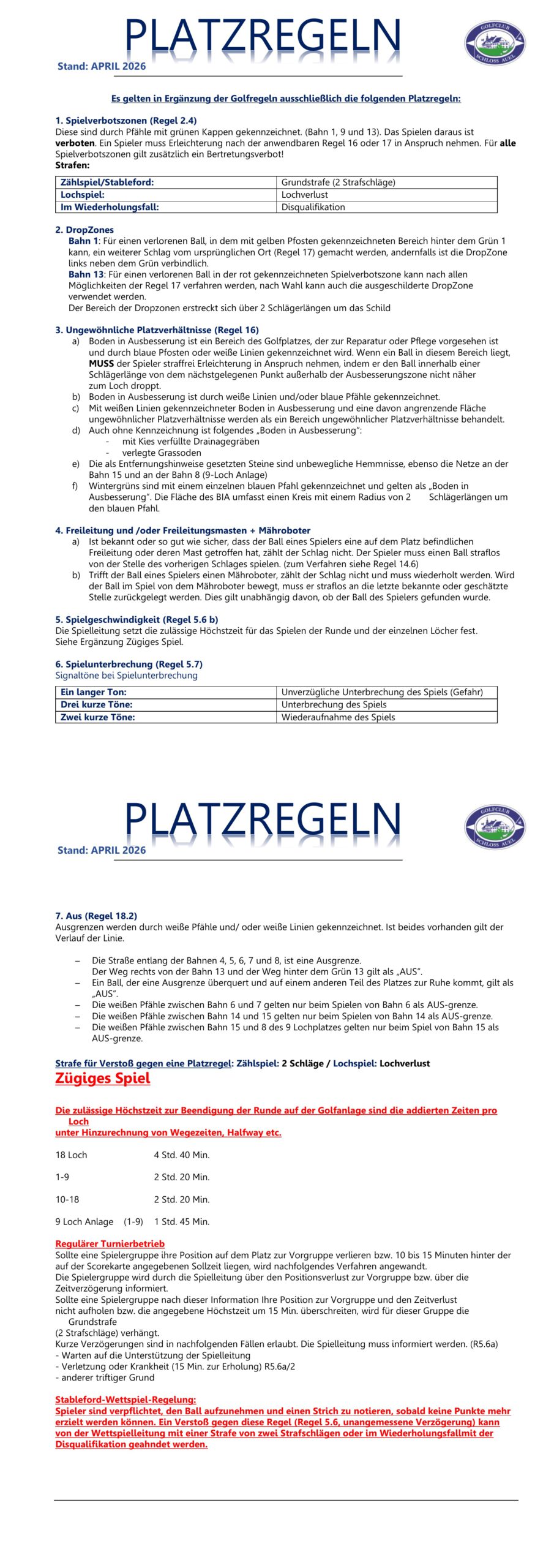 Nachfolgend sind unsere aktuellen Platzregeln beschrieben. Für Wettspiele und EDS-Runden sollte die Lektüre ein MUSS sein. Wer alle Regeln kennt, kann diese natürlich auch zur Unterstützung seines Spiels nutzen. Es soll schon Spieler gegeben haben, die z.B. auf Grund getroffener Strommasten nicht die korrekte Verfahrensweise angewendet haben. Dies führt dann natürlich zu entsprechenden Strafschlägen oder gar zur Disqualifikation.